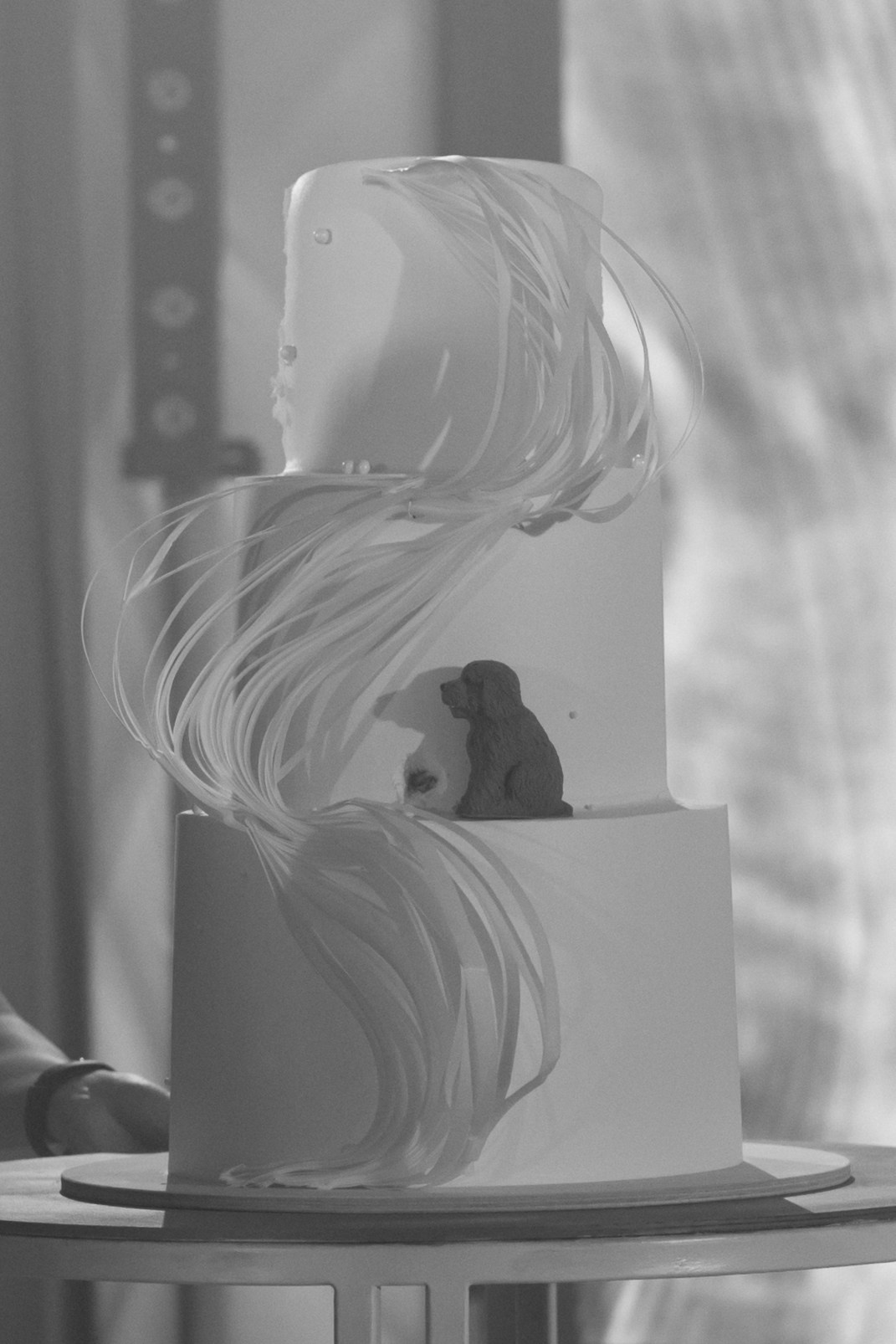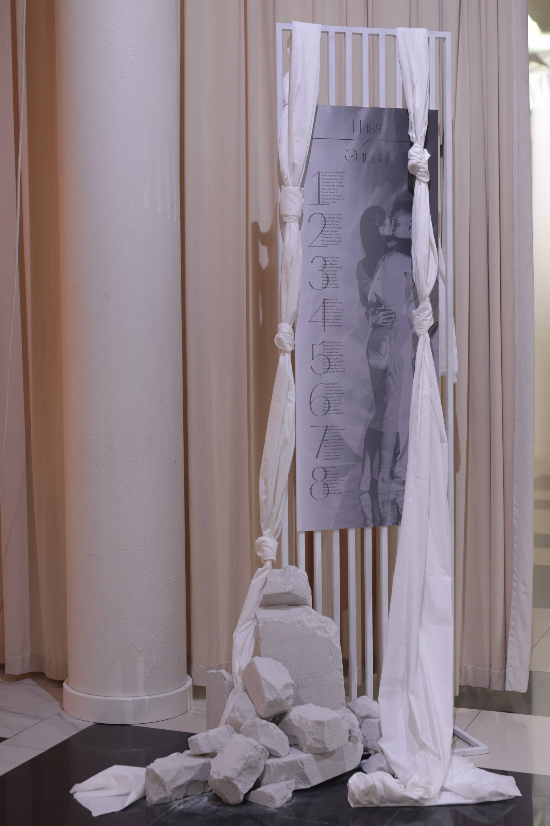 Элина в утреннем и основном образах словно Афродита, вышедшая из морской пены — лёгкая, воздушная, нежная. В декоре узлы и разные фактуры помогли передать концепцию этого прекрасного дня. Каждая деталь праздника отражала пару: Элина сама создала свой свадебный букет, вложив в него частицу души. На welcome-зоне гости расписывали кашпо для цветов, оставляя тёплые пожелания, а трогательным символом вечера стал холст с отпечатками рук молодожёнов и их любимого пёсика Ричи, фигурка которого появилась и на торте.